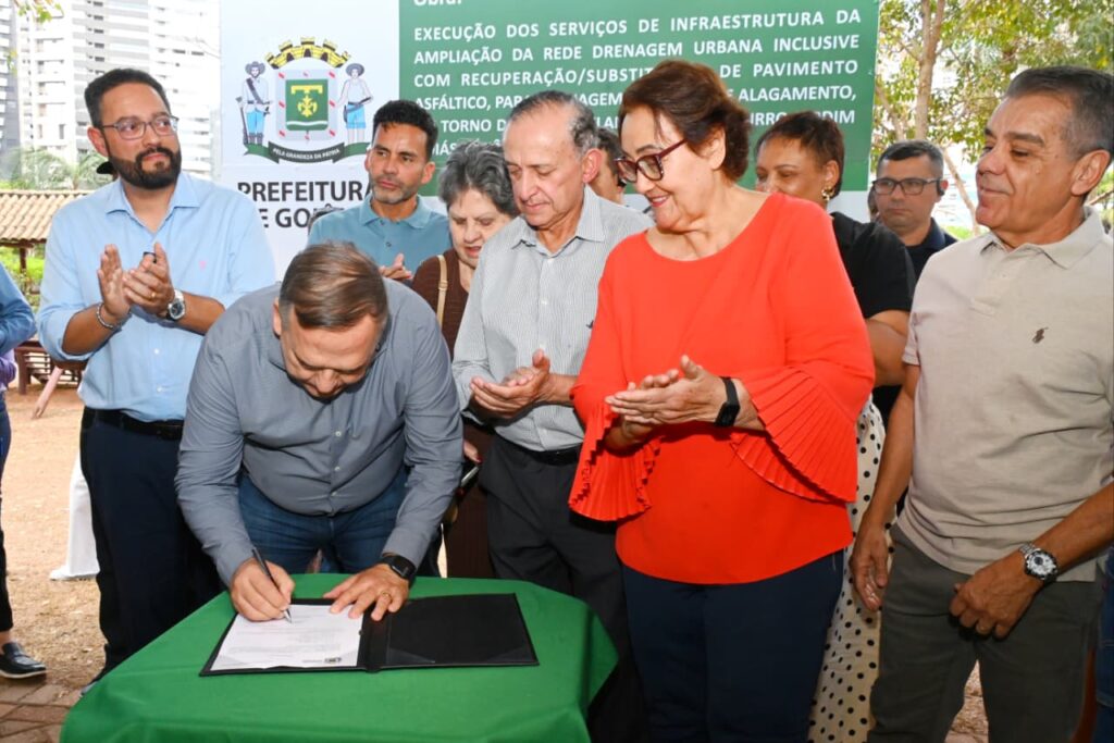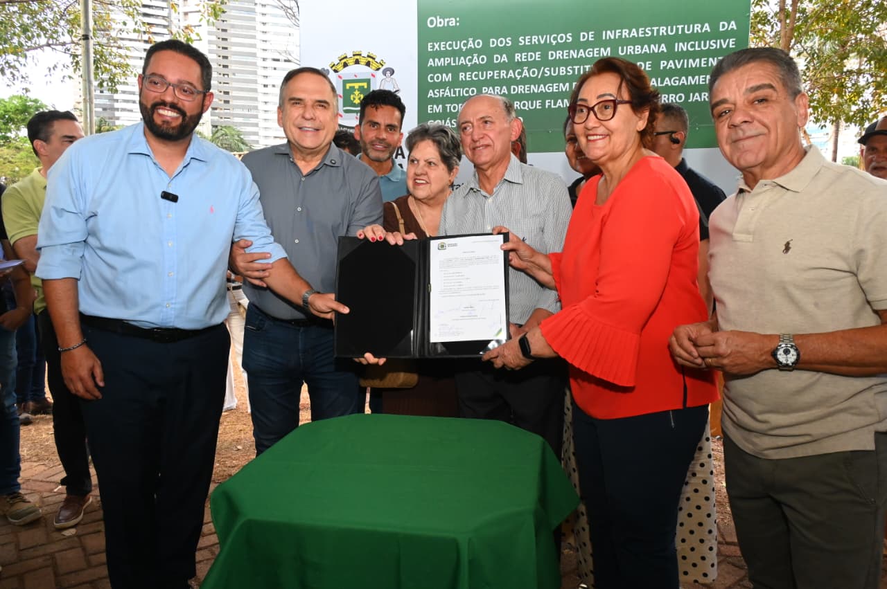 O prefeito Sandro Mabel assinou nesta segunda-feira (1º/9) a ordem de serviço para ampliar a rede de drenagem urbana no entorno do Parque Flamboyant. A iniciativa tem como objetivo evitar alagamentos e recuperar o pavimento das ruas próximas ao parque. Com investimento de R$ 6.149.853,78, a obra tem prazo estimado de execução de 180 dias e abrangerá a recuperação do pavimento em 11 vias: ruas 53, 54, 55, 56, 58, 59, 61, 62, 66, 15 e Avenida E.