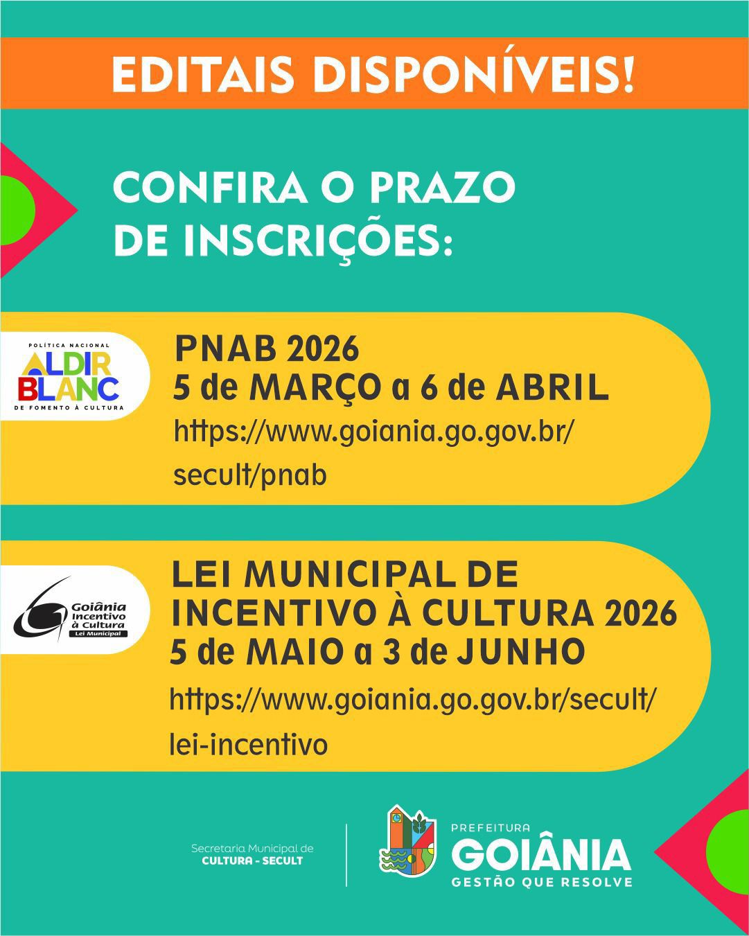 Informações detalhadas sobre os editais, critérios de participação, prazos e formas de inscrição estão disponíveis na página oficial da Secretaria Municipal de Cultura, no site da Prefeitura de Goiânia: www.goiania.go.gov.br/secult