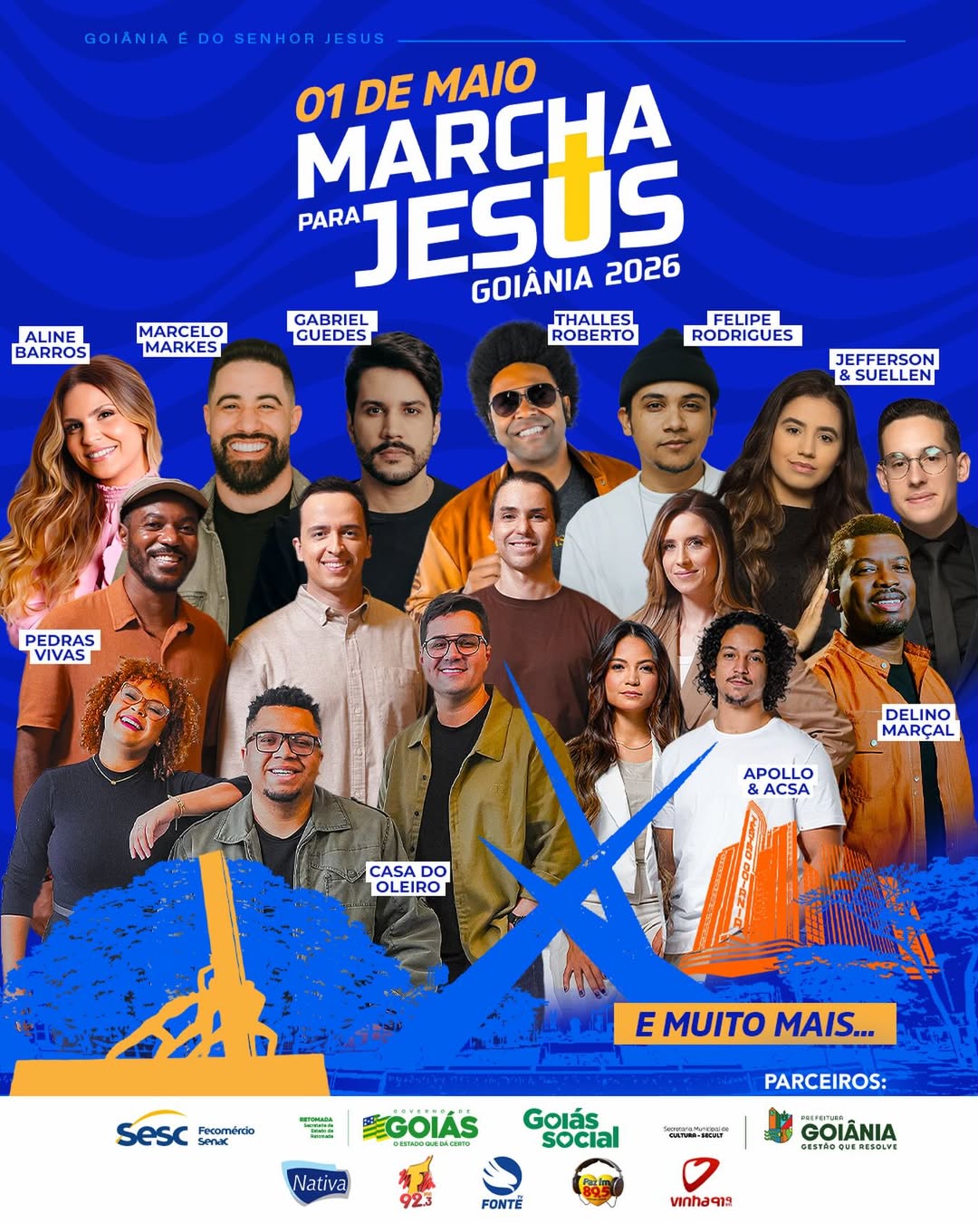 A Marcha para Jesus 2026 também conta com parceria do Governo de Goiás, Goiás Social, Sesc Fecomércio Senac, além de veículos de comunicação e instituições parceiras que fortalecem a realização do evento.