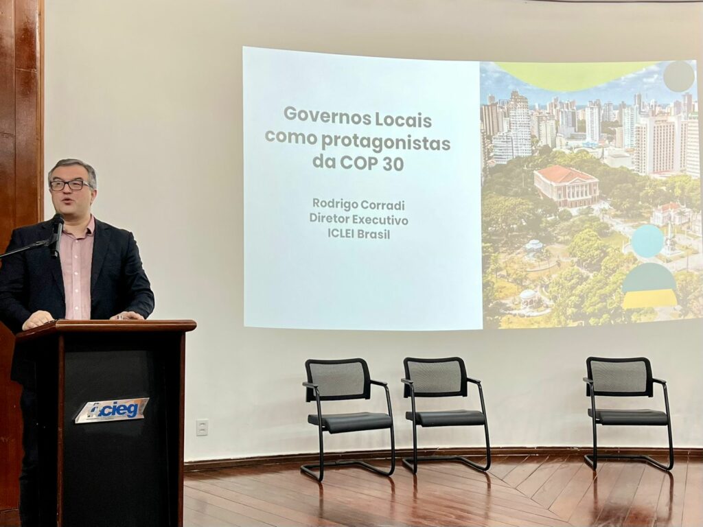 Rodrigo Corradi, primeiro palestrante do dia e secretário executivo adjunto do ICLEI América do Sul – organização internacional que promove o desenvolvimento sustentável por meio de governos locais – apresentou um panorama sobre a 30ª Conferência das Nações Unidas sobre Mudanças Climáticas (COP30), marcada para novembro deste ano, em Belém (PA). Corradi detalhou as mobilizações prévias de governos e entidades e destacou a importância da conferência como espaço estratégico para captação de investimentos voltados à sustentabilidade. “As COPs são realizadas anualmente porque acompanham uma agenda em constante evolução. Por meio delas, são criados novos capítulos dentro da Convenção-Quadro das Nações Unidas sobre Mudanças Climáticas”, explicou.