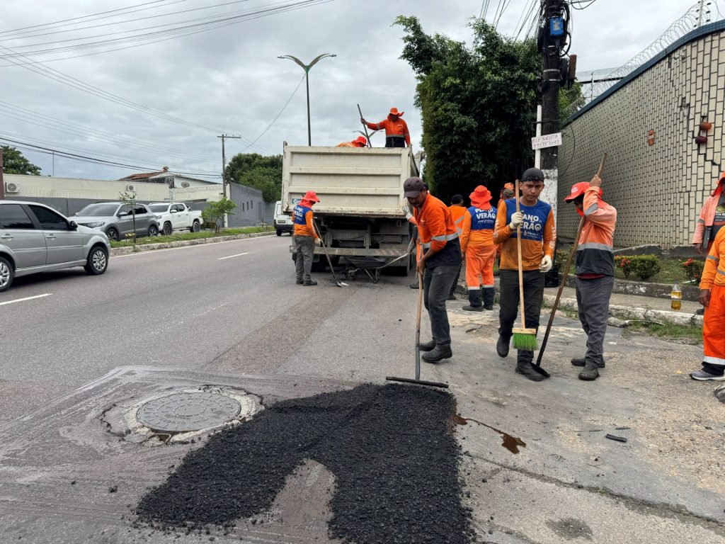 Prefeitura de Manaus atua na recomposição do asfalto em duas avenidas após intervenções da concessionária Águas de Manaus.