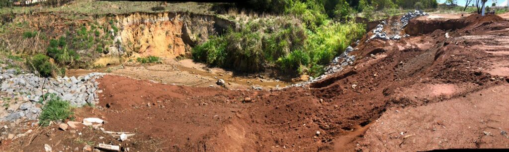 Para recompor a rede de lançamento, foram instalados 17 novos tubos, totalizando, 11 metros de rede de drenagem recuperados. Agora, as equipes concentram os esforços na estabilização do terreno e na recuperação da área que cedeu em decorrência das chuvas.