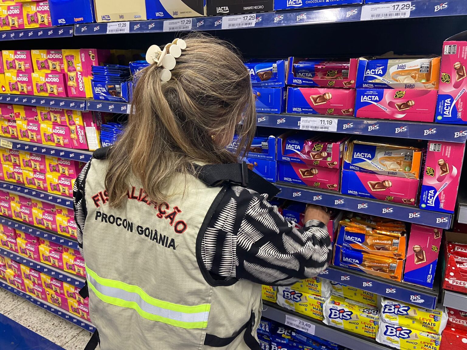 Durante a fiscalização, os agentes identificaram divergências em diversos itens. Entre eles, 48 unidades de chocolate meio amargo Lacta (145g), 255 unidades de chocolate ao leite Lacta (80g) e 153 unidades de chocolate ao leite com recheio cremoso (98g), todos apresentando valores distintos entre prateleira e caixa.