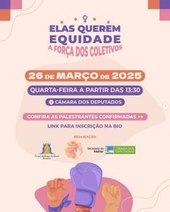 A Secretaria da Mulher da Câmara dos Deputados promove nesta quarta-feira (26) o seminário “Elas querem equidade – A força dos coletivos”. Em sua terceira edição na Câmara dos Deputados, o evento tem o objetivo é fortalecer a sociedade na luta pelo protagonismo das mulheres na política e nos espaços de poder.