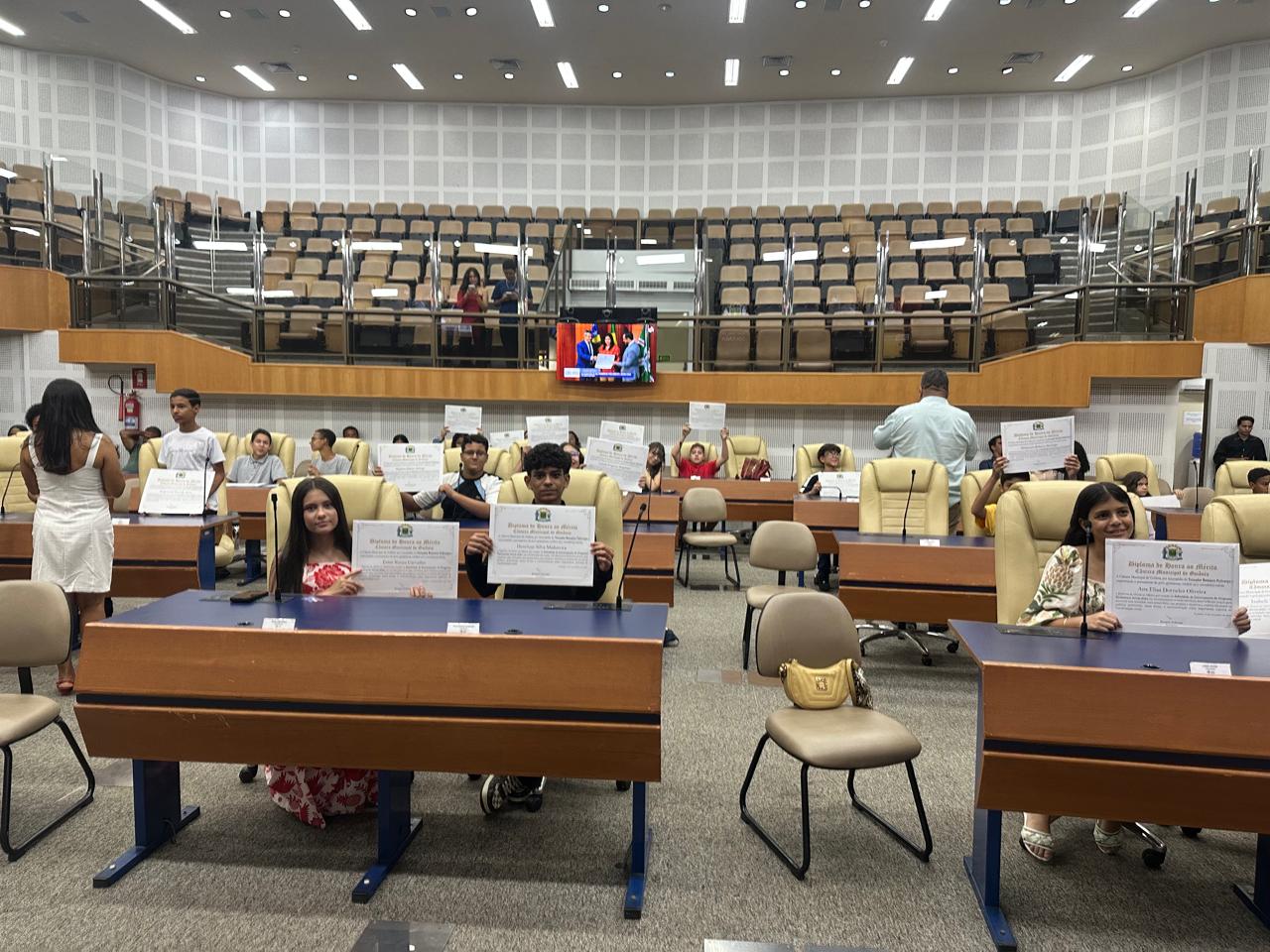 A Câmara Municipal de Goiânia realizou, nesta sexta-feira (14/11), uma solenidade em homenagem a vereadores mirins de escolas da rede municipal e coordenadores do projeto Parlamento Jovem. A iniciativa, proposta por vereadores da capital, reconheceu o compromisso e a dedicação dos envolvidos no Projeto. Durante a cerimônia, os homenageados receberam diplomas de menção honrosa pelos trabalhos desenvolvidos em prol da educação municipal e pela participação ativa nas atividades legislativas simuladas.